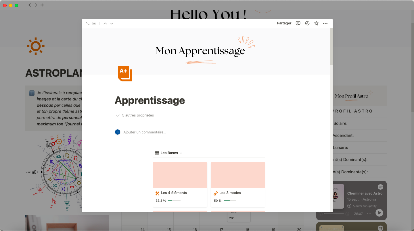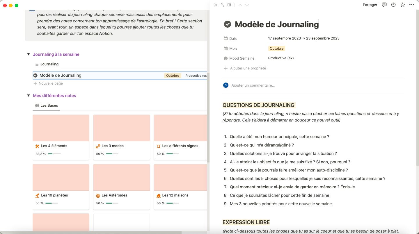 Dans ce template Notion spécial Astro, tu retrouveras des bases de données et des tableaux de bord spécifiques pour :